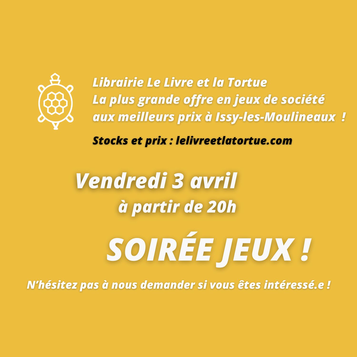 Le vendredi 3 avril, venez à la librairie à partir de 20h. On pousse les meubles, on installe les tables et les chaises et c’est parti pour la soirée jeux. Et c’est sans inscription !