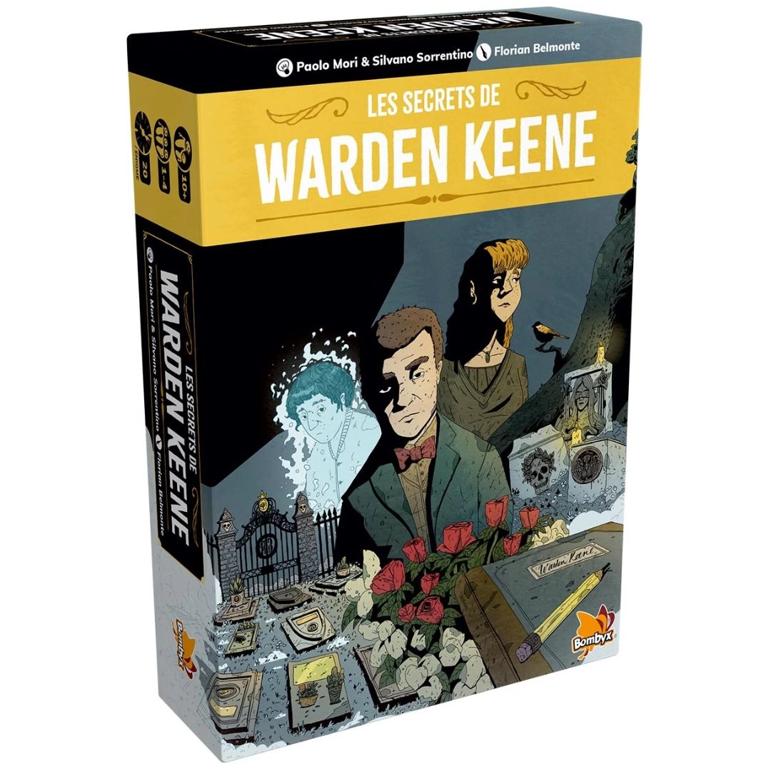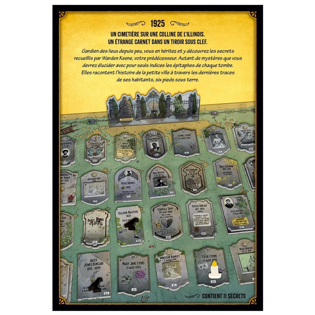 Les Secrets de Warden Keene est un jeu d’enquête narratif et immersif pour 1 joueur ou plus. Dans ce jeu de société, vous plongez dans les histoires tragiques des habitants du cimetière de Spoon River en observant leurs pierres tombales et en décryptant le journal du gardien.